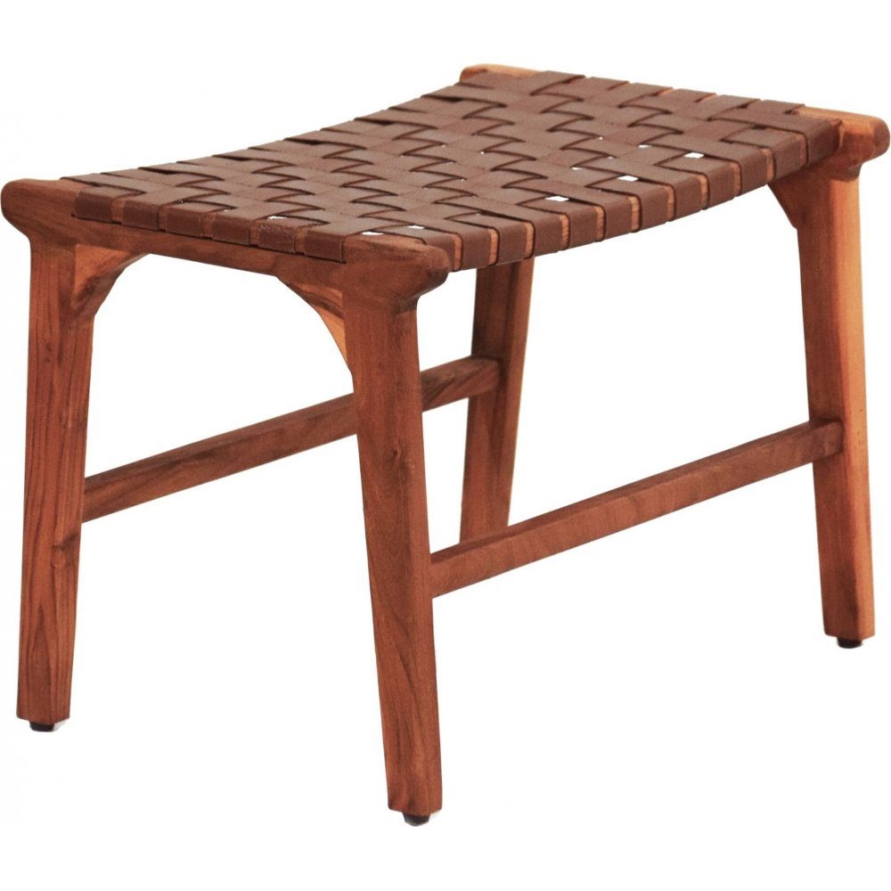 Porto Bello fotpall i massiv akacia med teakutförande. Sits av sadelgjord konjaksbrunt anilinläder. Fotpallen tillhör vår populära serie Porto Bello.