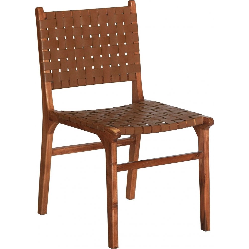 Porto Bello stol i massiv akacia med teakutförande. Sits och rygg sadelgjord av konjaksbrunt anilinläder. Stolen tillhör vår populära serie Porto Bello.