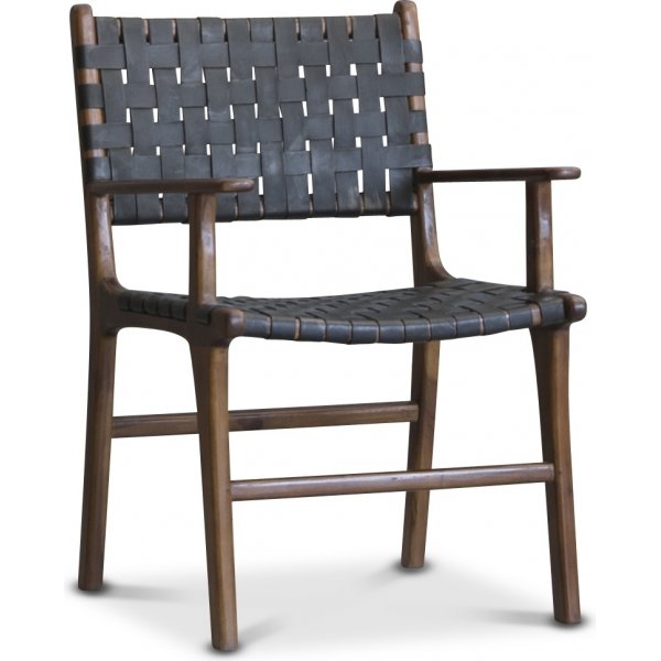 Retro karmstol med sits i sadelgjord av svartfärgat läder. Massiv trästomme i Teak. karmstolen tillhör vår populära serie Porto.
