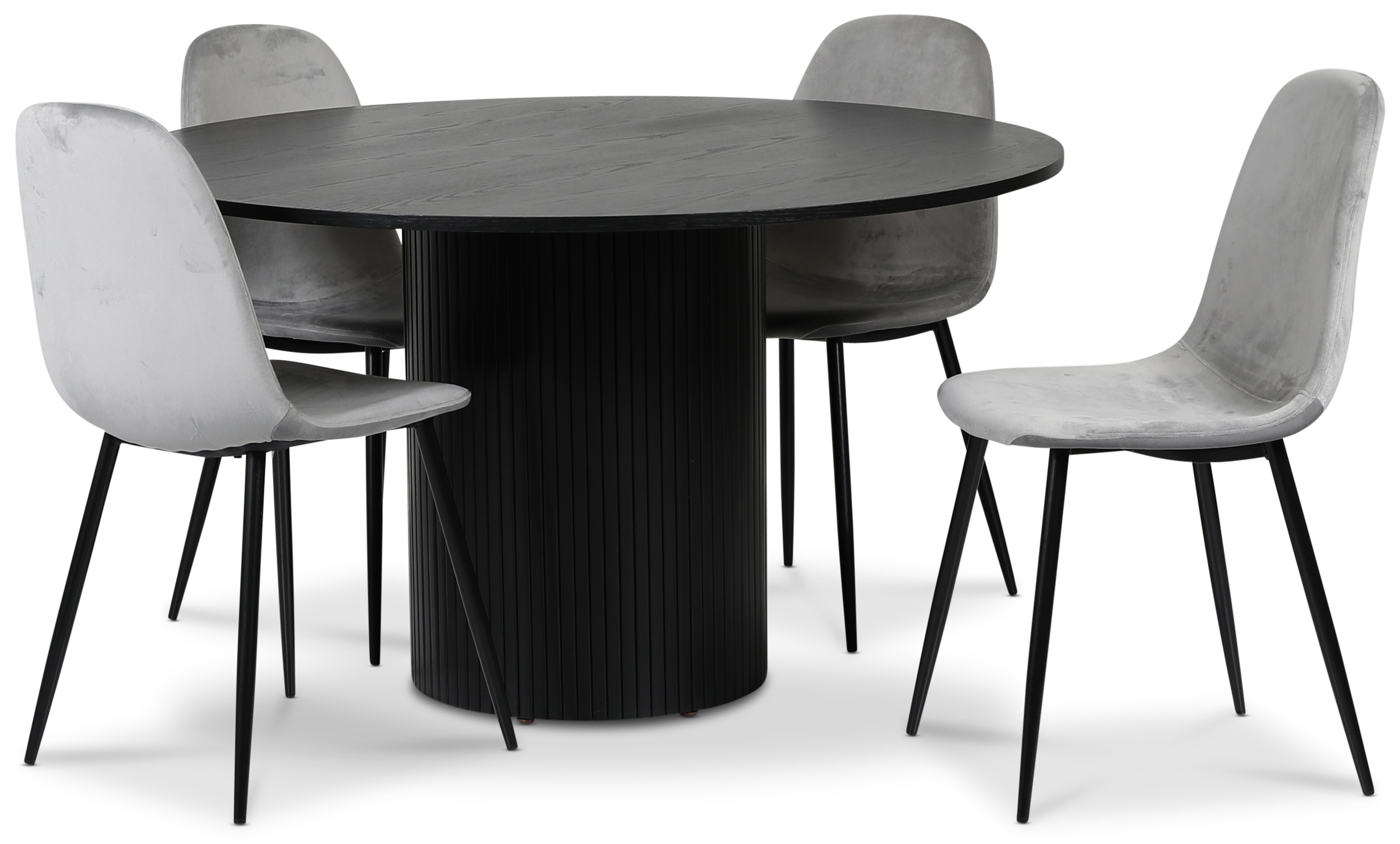 Modern matgrupp, Pose matbord med svartbetasad ekfanerad toppskiva, underrede av massivt svartbetsat trä. Matchande Carisma stolar i mjuk grå sammet med svarta metallben.