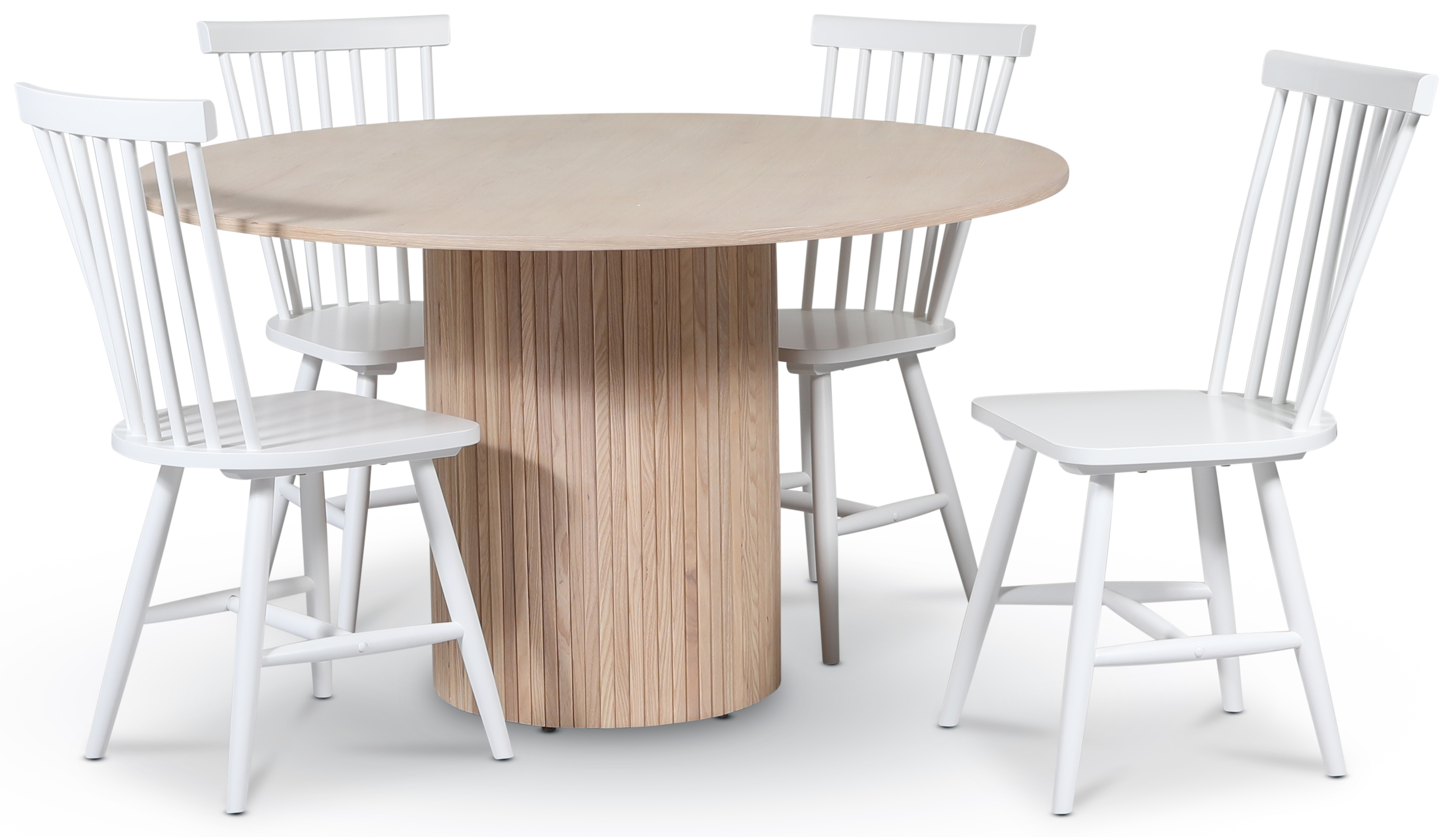 Pose matgrupp: Bord Ø130 cm inklusive 4 st vita pinnstolar - Whitewash