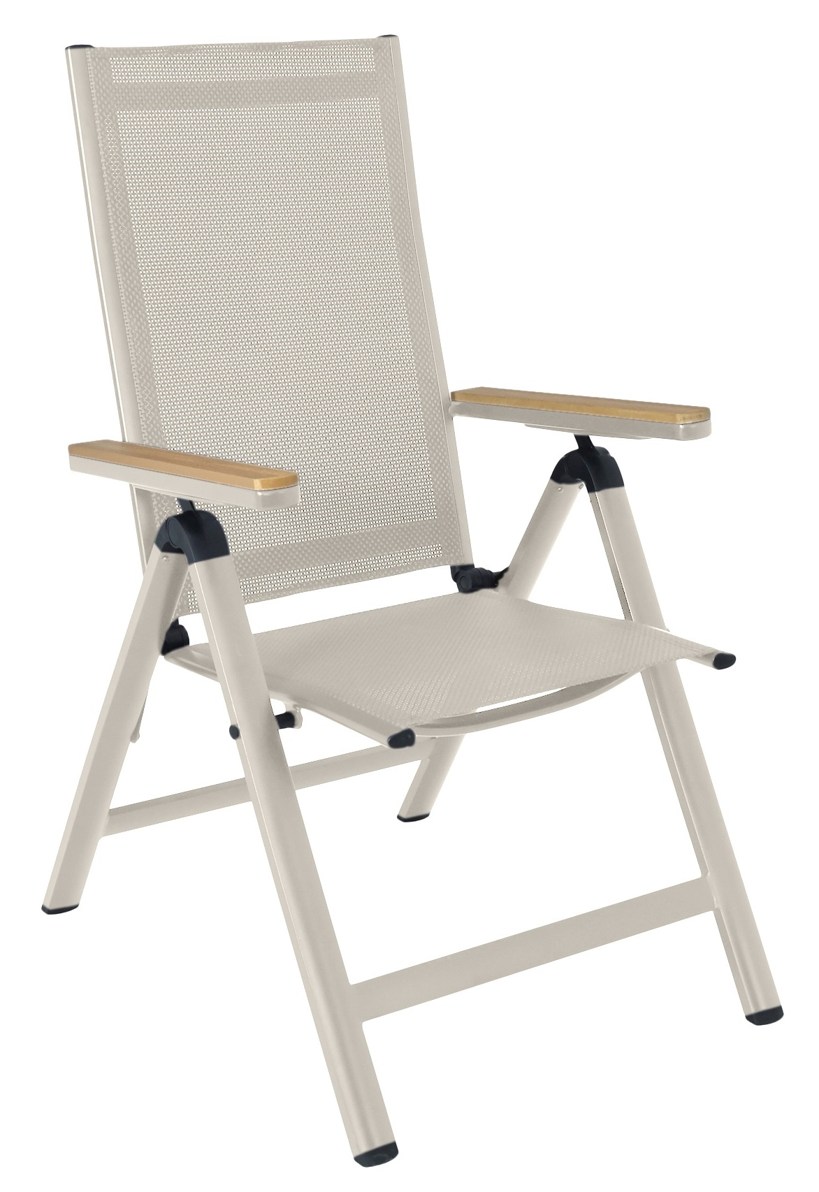 Svea positionsstol i aluminiumstomme med beige textilene med armstöd i ek-aintwood. Ryggstödet kan fällas i 5 positioner för att få drömpositionen.