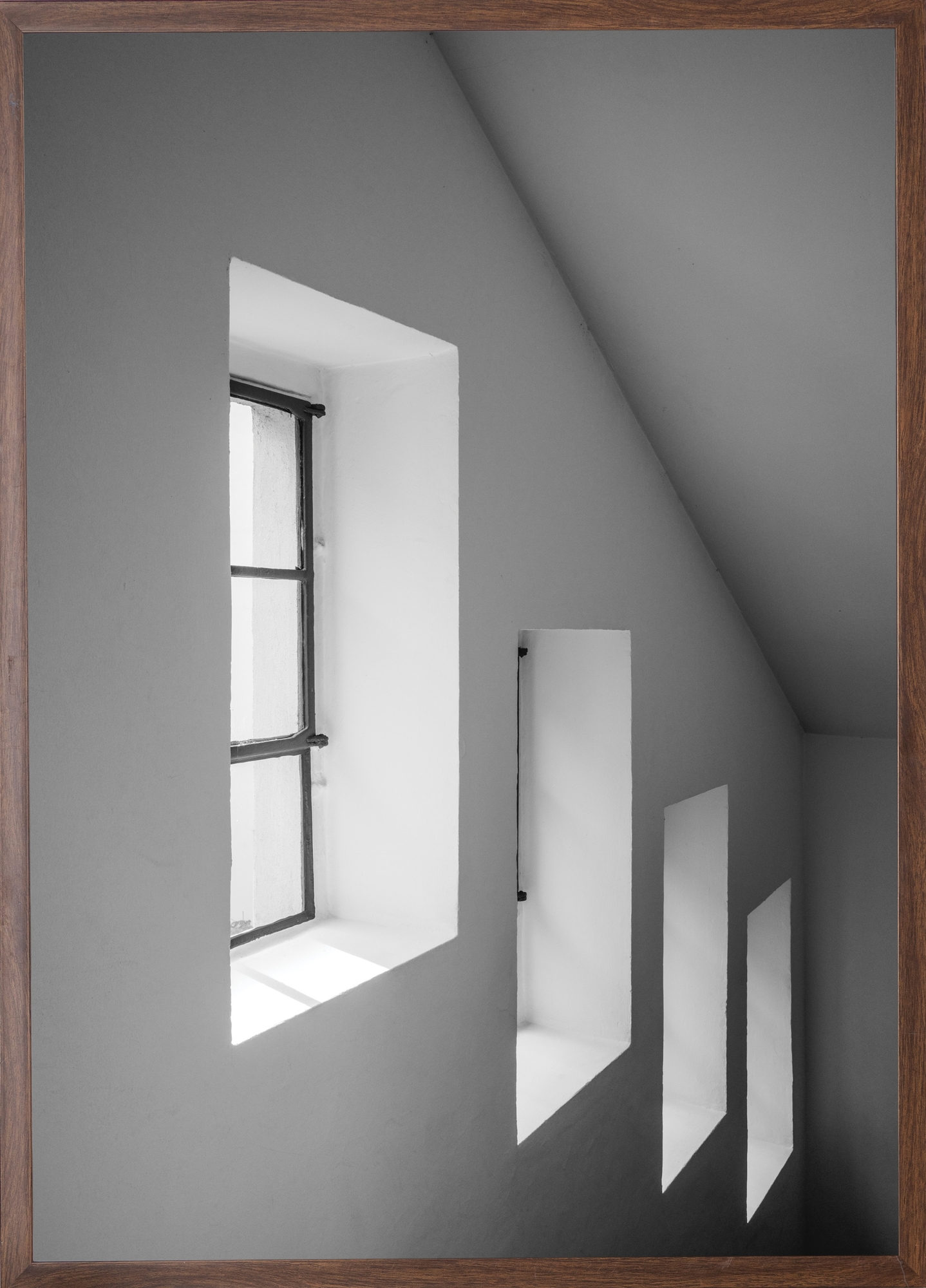 Släpp in ljuset och inred dina väggar med den här stilsäkra och moderna fotopostern! De fyra fönstrena med gammeldags vacker spröjs släpper in solens strålar som dansar på de vita väggarna i gången ner. Det enkla kan ibland vara det som fattas för att rummet ska få den sista lilla finishen och för att fullända inredningen på ett modernt och trendigt sätt.