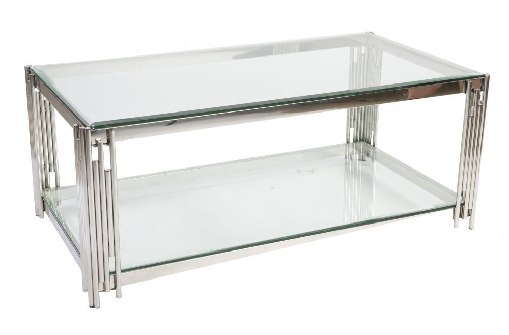 Snyggt soffbord med en modern design. Benen och ramen är tillverkade i kromad metall med två bordsskivor i klarglas. Den praktiska underhyllan är perfekt för förvaring. Bordet passar perfekt in i hushållet tillsammans med dem flesta soffgrupperna.