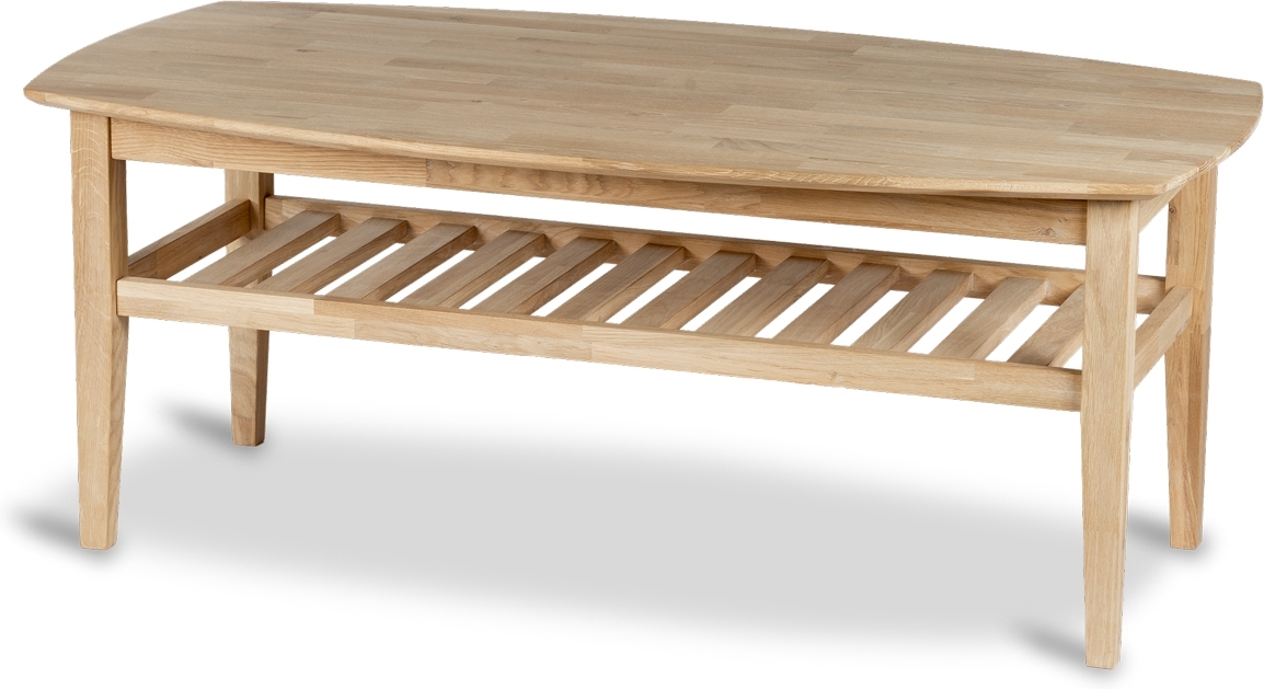 Traditionellt soffbord i massiv vitoljad ek med en hylla för förvaring.