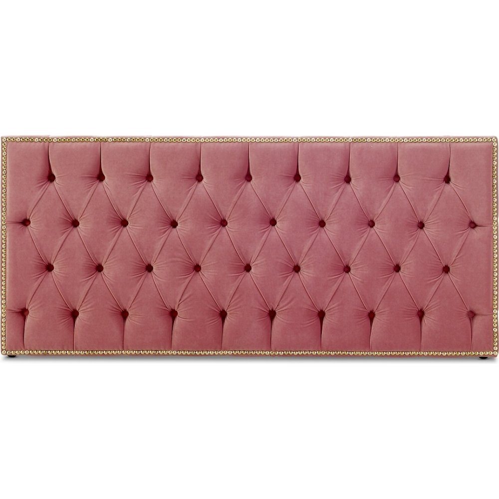 Princess sänggavel ramar med sina mässingsfärgade nitar in en snyggt pikerad sänggavel. Modellen är golvstående och är klädd i ett ljusgrått tyg(Orinoco 21).