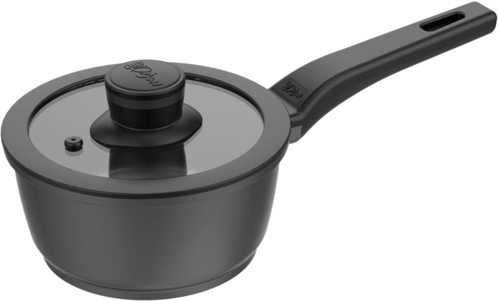 Modern kastrull i svart, tillverkad av aluminum. Lock av glas.
