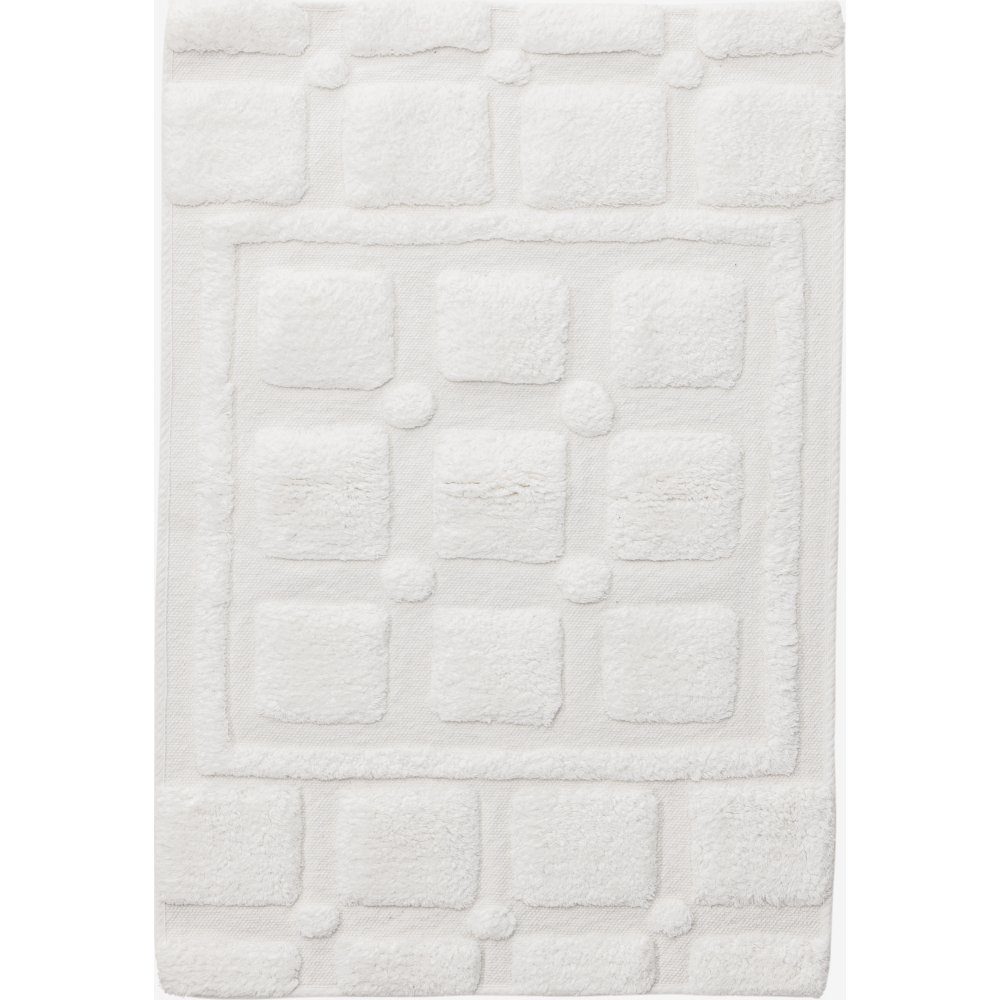Rektangulär badrumsmatta tillverkad av mjuk bomull. Den vita färgen ger en skandinavisk touch och den mjuka och gosiga ytan kommer att ge en extra känsla av komfort. Denna badrumsmatta kombinerar stil och funktion på ett perfekt sätt. Den absorberar effektivt fukt, vilket håller dina fötter torra och bekväma efter duschen. Dess rektangulära form ger en modern och strukturerad look till din badrumsinredning. Med sitt eleganta mönster och skandinaviska designelement kommer den att ge en fräsch och mysig atmosfär till ditt badrum. Ge ditt badrum en uppdatering och skapa en avslappnad och inbjudande atmosfär.