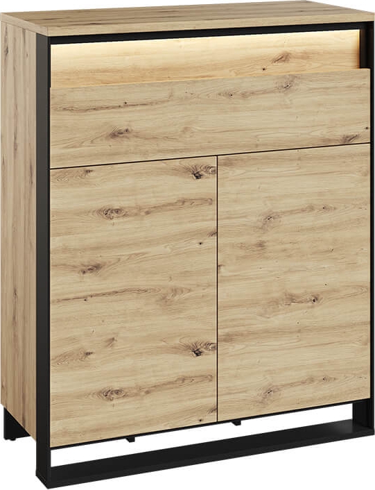 Byrå av laminerad spånskiva med inbyggd LED-belysning. Handtagslös "push-to-open"-mekanism. Levereras omonterad.