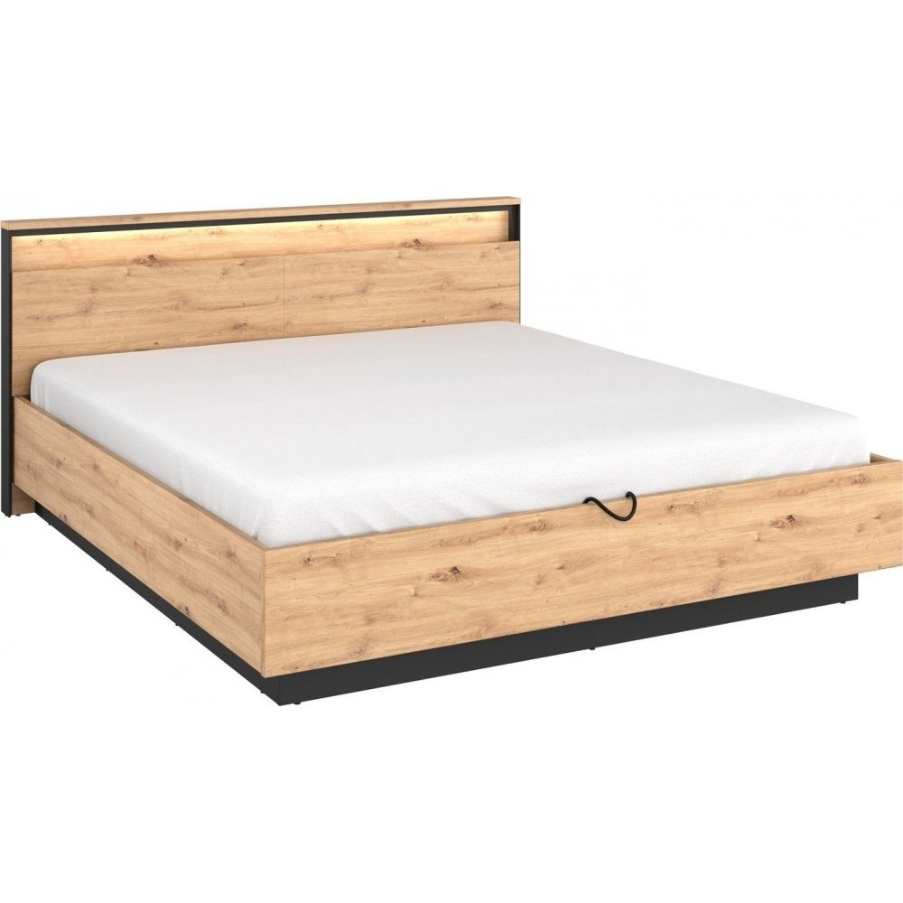 Säng av trä med förvaringsutrymme och integrerad sänggavel med LED-belysning. Gasfjädrar på båda sidor hjälper till att lyfta och hålla uppe ribbotten för åtkomst till förvaringsutrymmet. Levereras omonterad. Madrass ingår ej.
