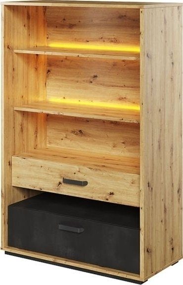 Bokhylla av trä med LED-belysning och handtag av metall. Levereras omonterad.