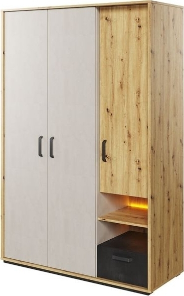 Garderob av trä med LED-belysning och handtag av metall. Levereras omonterad.
