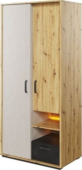 Garderob av trä med LED-belysning och handtag av metall. Levereras omonterad.