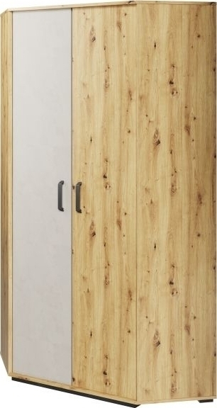 Hörngarderob av trä med handtag av metall. Levereras omonterad.