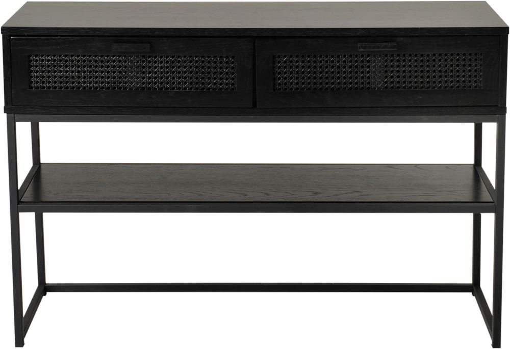 Prydligt konsolbord med skivor av svart ekfanér och stomme av svart metall. Bordet är även utrustat med 2 lådor, flätade fronter. Perfekt för förvaring av småprylar.