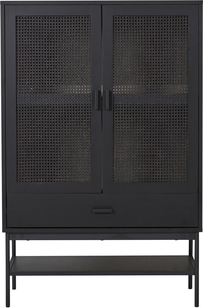 Vitrinskåp i svart ekfanér med 2 dörrar, svart metallunderrede med underhylla.