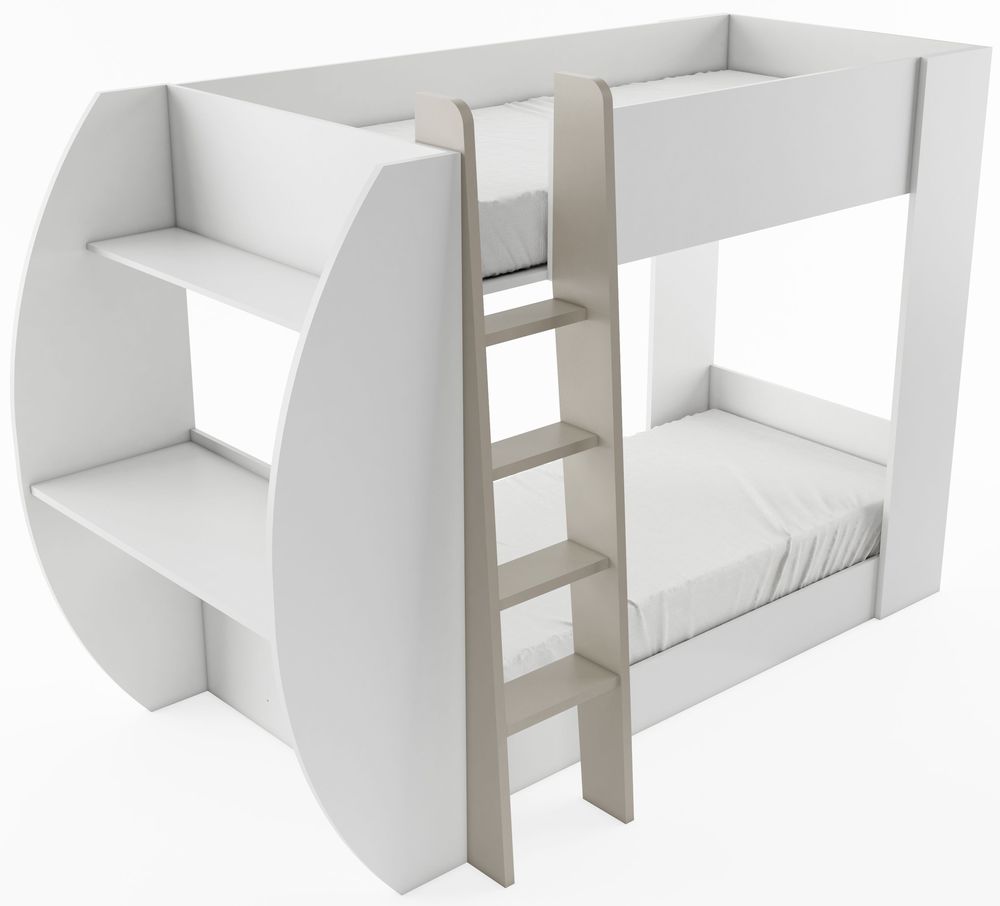 En mysig och praktisk våningssäng med en modern design. Tillverkad i MDF med två i ett. Två bekväma sängar, varav den översta våningen har skyddsväggar för att undvika att man faller ut ur den. Till det är där en stadig och kraftig stege som man kan använda säkert. På ena änden är där två hyllplan som kan användas för förvaring, men kan även användas som ett praktisk skrivbord.