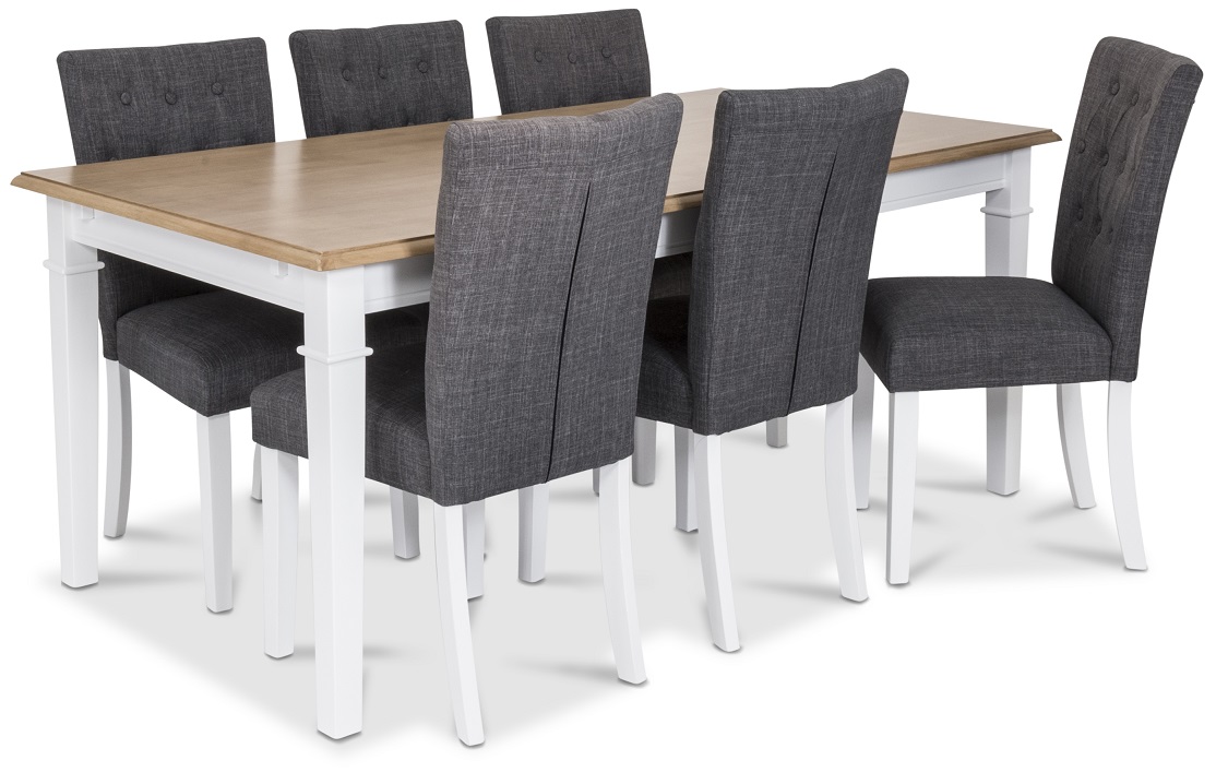 Matgrupp från Skånska möbelhuset i massivt hevea trä med bordsskiva i ek och underrede i vitt. Medföljer gör också 6 st helklädda stolar i grått tyg.