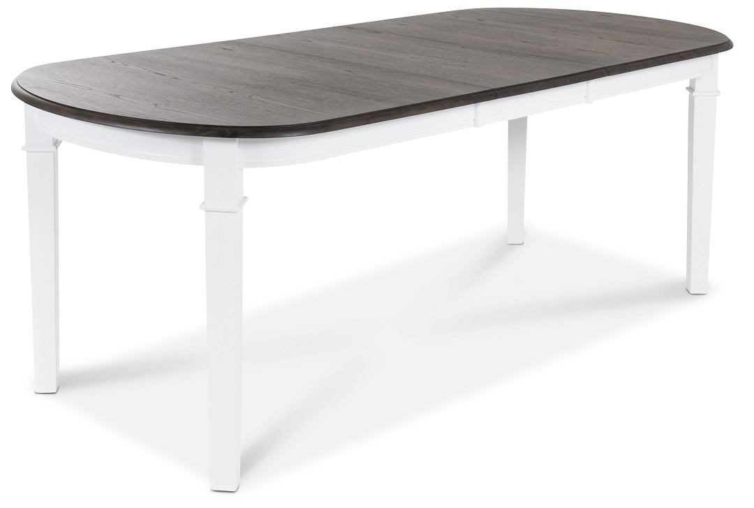Stilfullt och massivt bord med vitlackat underrede och bordsskiva i fanerad brunoljad ek! Bordet är 95 cm brett för att få extra mycket plats för matgästerna samt att det går att förlänga från 160 cm till 200 cm med hjälp av iläggsskivan som medföljer!