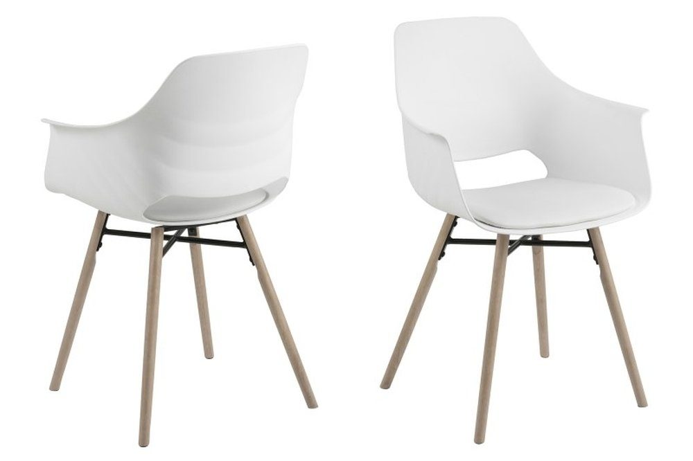 Behaglig matstol, gjord på vit plast och dynan är klädd med vitt konstläder (PU) med benen är gjorda på vitpigmenterad och oljebehandlat gummiträ.