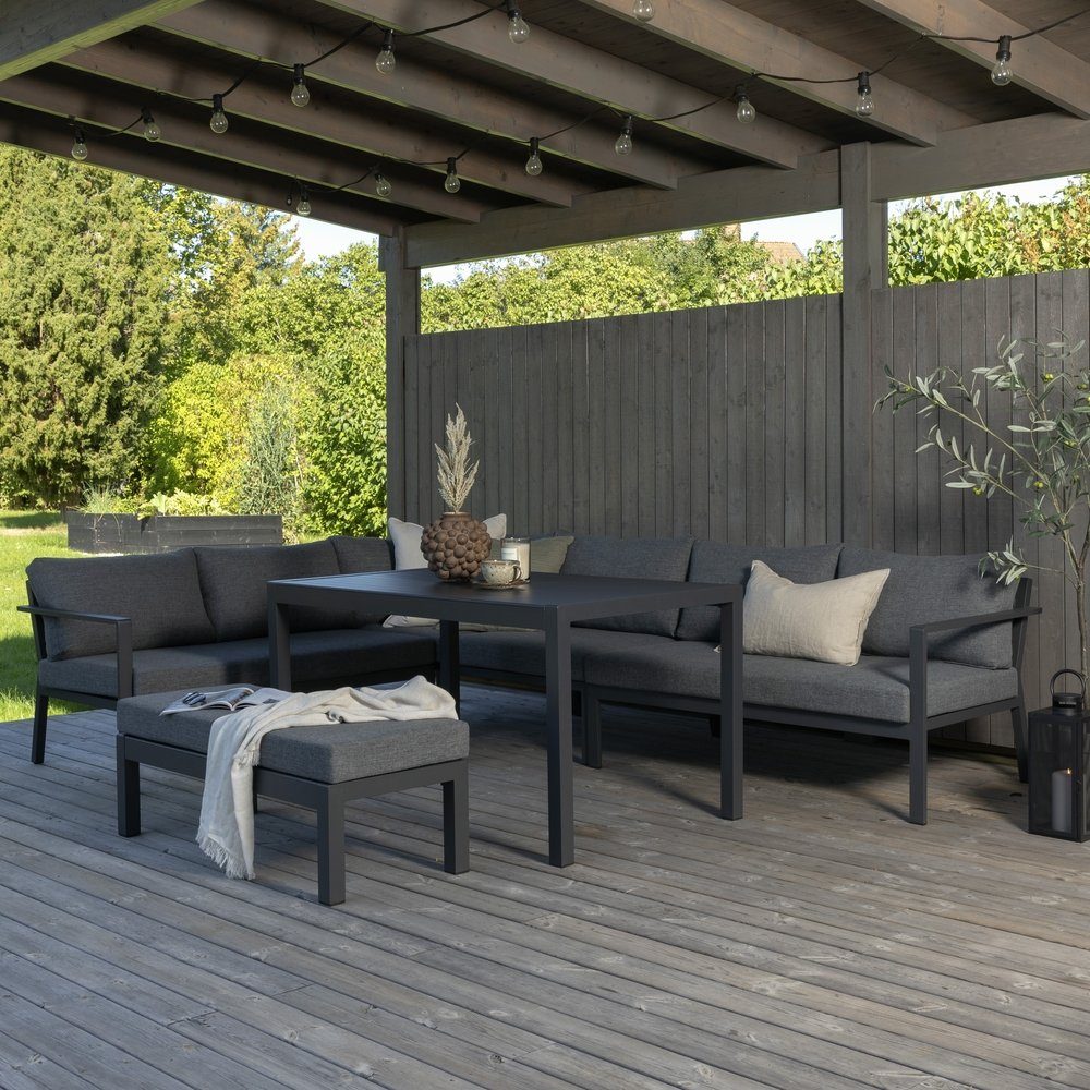 Ramos hörngrupp fungerar utmärkt för er som umgås många och har en större altan eller uteplats! Med sin tidlösa design och tåliga material är det en möbel som fungerar under många år. Perfekt för en fika eller varför inte läsa en bok i solen? Stommen är i svartlackerad aluminium med dynor i grått. Skötselråd:Utemöbler i aluminium och rostfritt stål bör rengöras regelbundet med vatten och mild tvål. Skölj alltid noggrant med rikligt med vatten, något som blir extra viktigt om möblerna är placerade på ett havsnära avstånd där salt kan transporteras via luften. Saltet kan leda till korrosion som kan orsaka flagning eller bubblor i lacken. Tvätta inte möblerna med högtryckstvätt, ytan kan skadas av det höga trycket. För maximal livslängd rekommenderar vi att möblerna förvaras i ett torrt utrymme, alternativt under ett möbelskydd. Aluminium är ett lätt material vilket gör att dina möbler blir smidiga att förflytta.