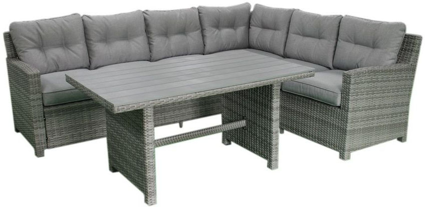 Ravenna ger dig en utemöblegrupp i klassikt konstrottingdesign med gott om plats. Bord och soffa i matchande ljusgrå konstrotting, hållbar ram i aluminium som klarar utemiljö. Bordsskiva av konstträ. Innehåller hörnsoffa samt matbord. Material aluminium, konstrotting och aintwood.