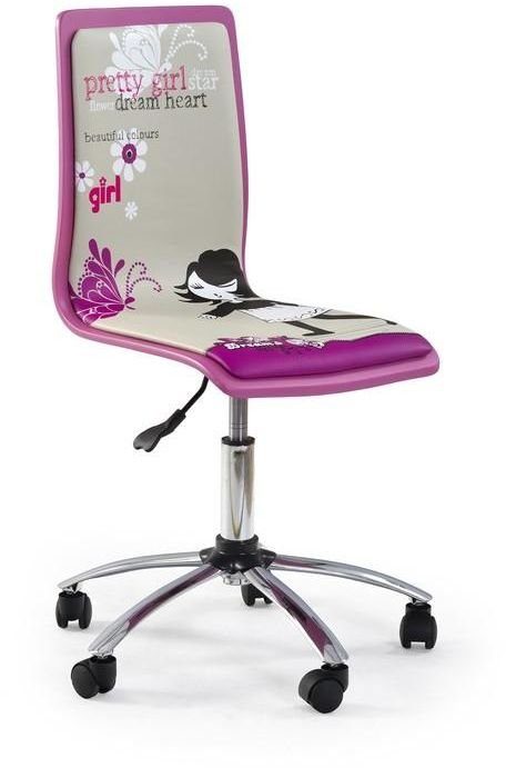 Ungdomlig skrivbordsstol med ett mysigt tryck på sitsen. Tillverkad i plywood med en behaglig klädsel i konstläder. Höj- och sänkbar sits och lätt att förflytta med hjälp av hjulen på den kromade stjärnfoten.