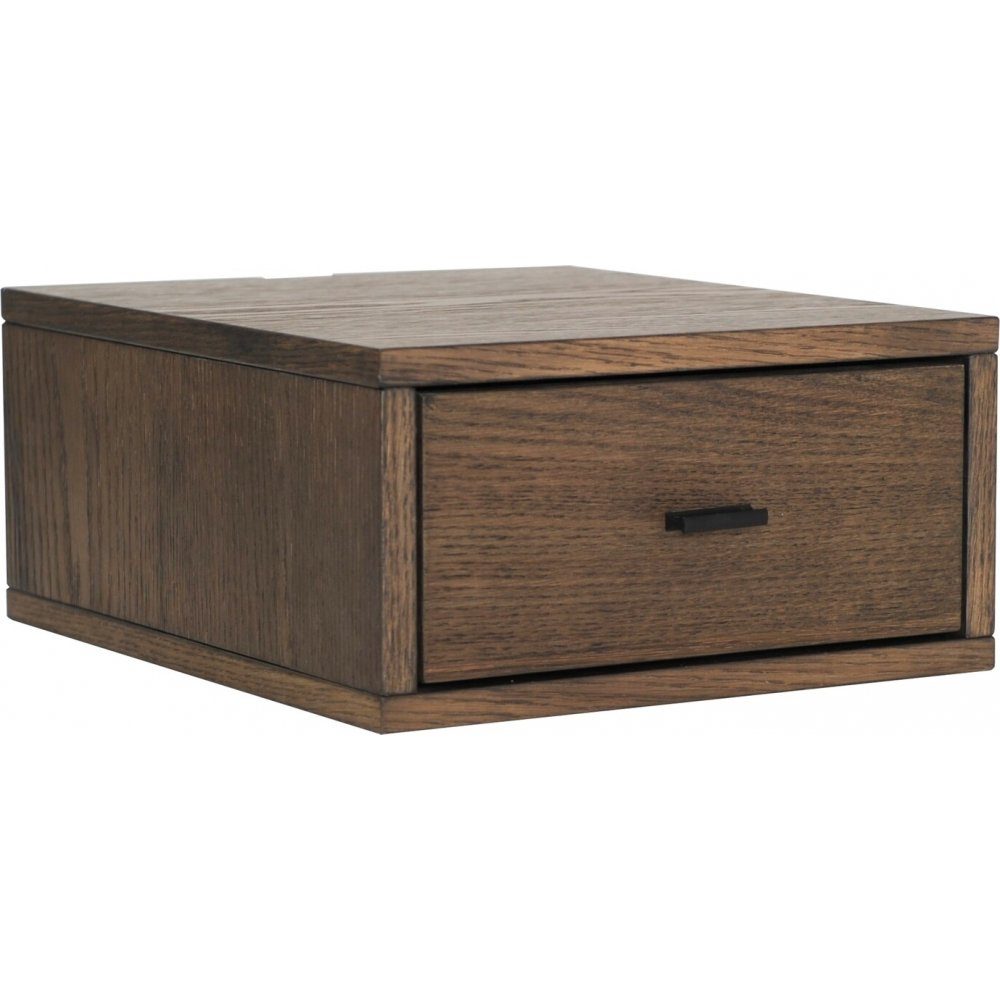 Vägghängt sängbord i brunlackad ekfanér med låda. Levereras monterad.