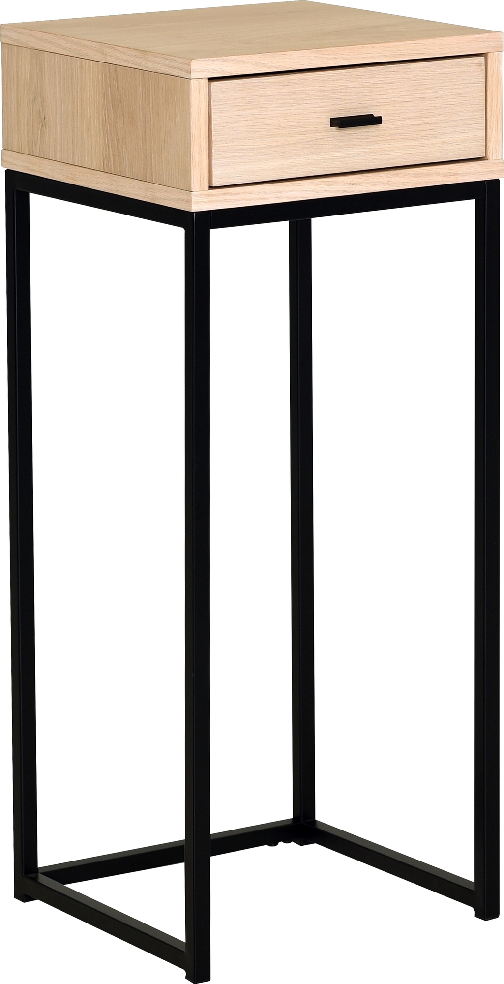 Sängbord med förvaringslåda i vitpigmenterad ekfanér med metallben. Levereras omonterad.
