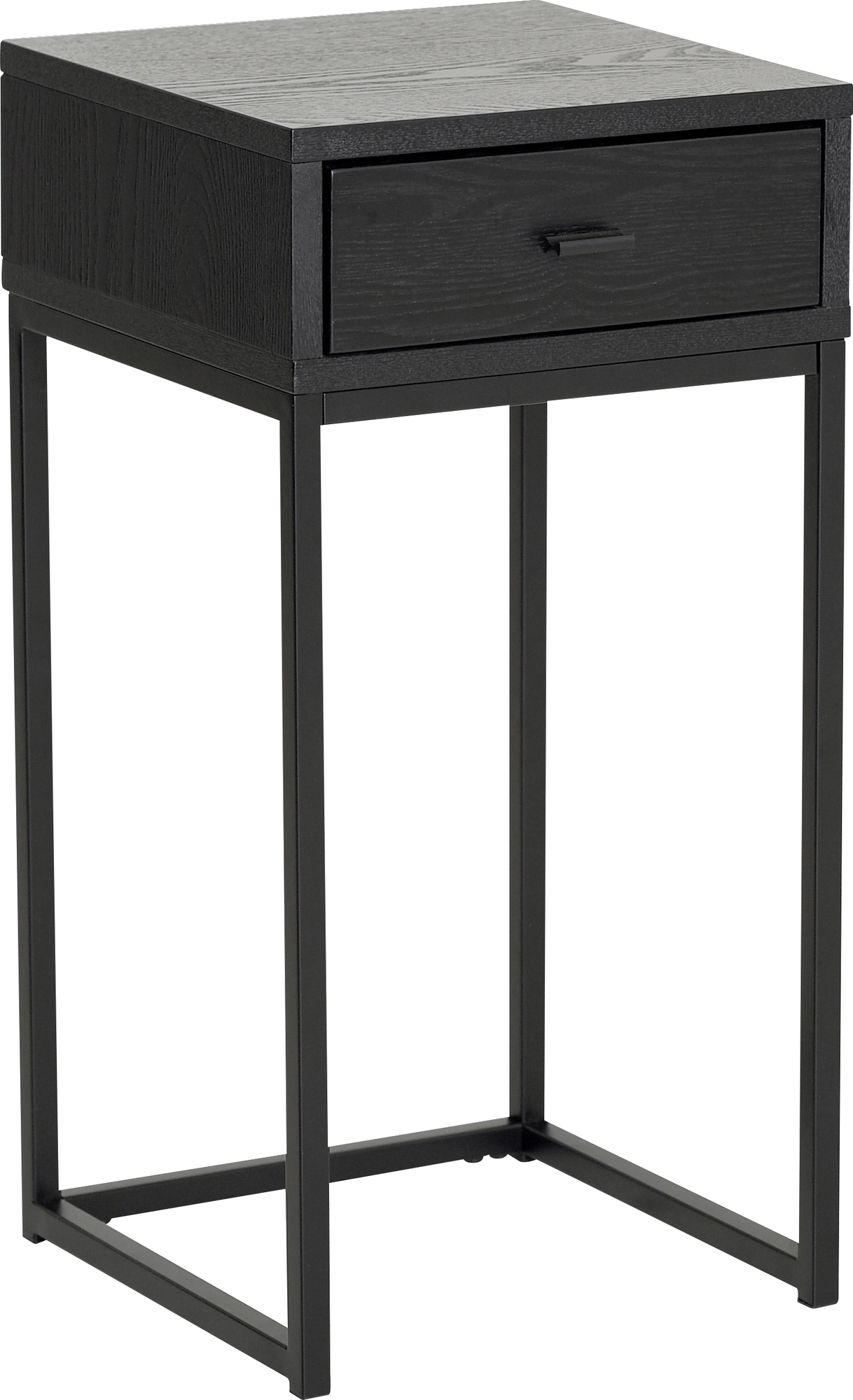 Sängbord med förvaringslåda i svartlackad askfanér med metallben. Levereras omonterad.