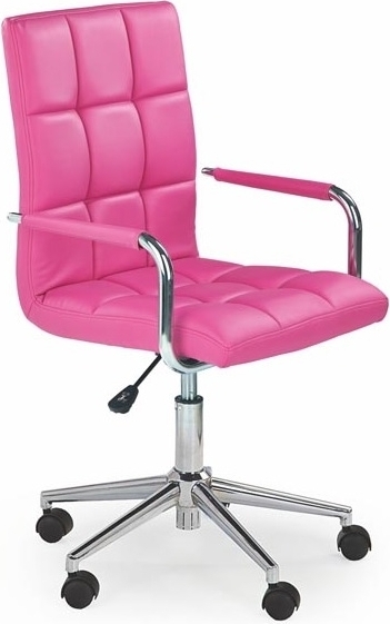 En härlig kontorsstol med en stilren design. Tillverkad i kromad metall med en mycket behaglig klädsel i rosa konstläder. Sitsen är höj-och sänkbar samt lätt att förflytta med hjälp av hjulen under stjärnfoten.