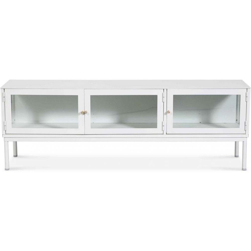 Skandinavisk design med stilrena linjer. Revel mediabänk i vit sandlackad plåt med klarglas och handtag i matt mässing. 3 st dörrar med klarglas och även klarglas på sidorna som släpper in ljuset i skåpet.