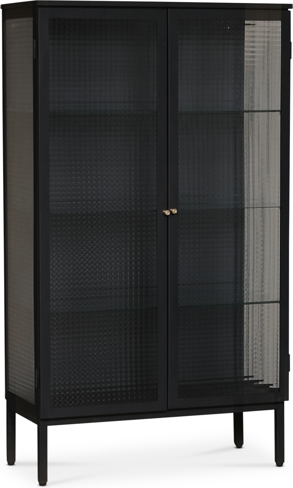 Skandinavisk design med stilrena linjer. Revel highboard i svart sandlackad plåt med rutmönstrat kristallglas och handtag i matt mässing. 2 st dörrar med rutmönstrat kristallglas och även rutmönstrat kristallglas på sidorna som släpper in ljuset i skåpet. Hyllplan i glas för att ge en "svävande" känsla.