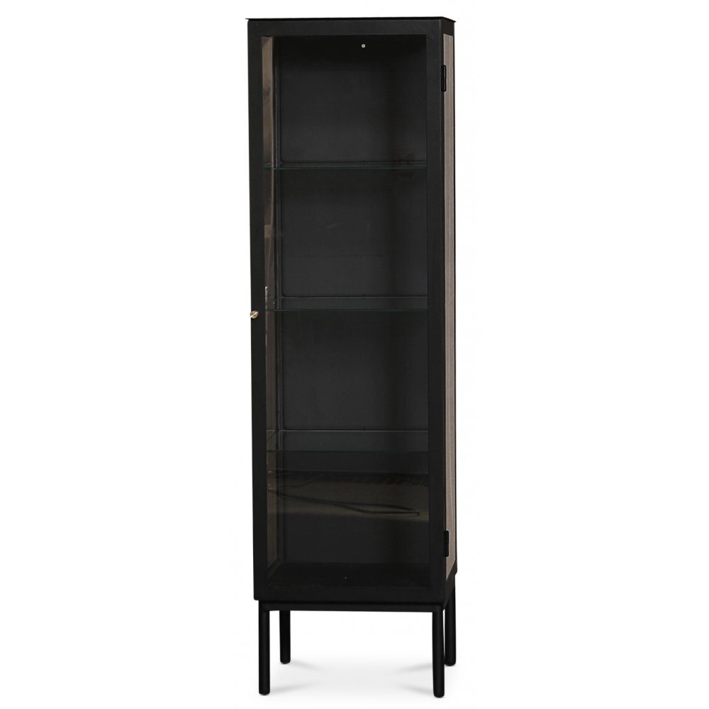 Skandinavisk design med stilrena linjer. Revel vitrinskåp i svart sandlackad plåt med klarglas och handtag i matt mässing. Skåpet har 1 st dörr med klart glas och även klart glas på sidorna som släpper in ljuset i skåpet. Justerbara hyllplan i glas för att ge en "svävande" känsla.