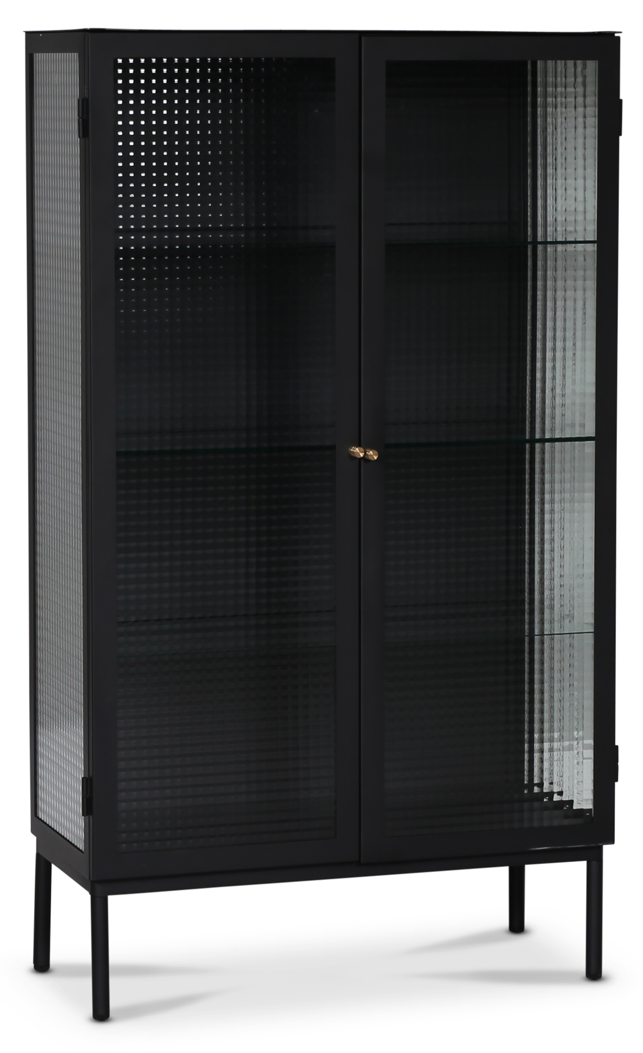 Skandinavisk design med stilrena linjer. Revel highboard i svart sandlackad plåt med kristallglas och handtag i matt mässing. 2 st dörrar med kristallglas och även kristallglas på sidorna som släpper in ljuset i skåpet. Hyllplan i glas för att ge en "svävande" känsla.