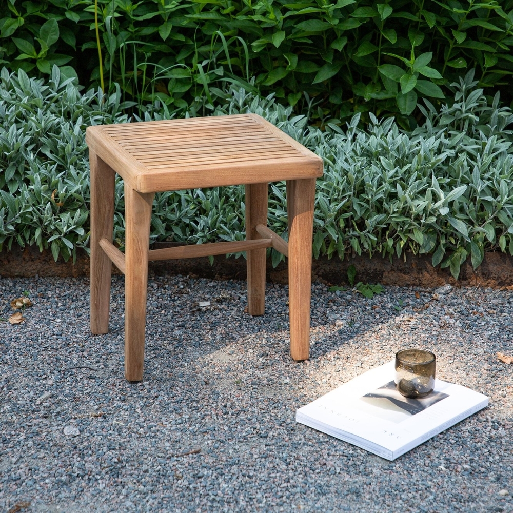 Den här pallen från serien Ribbon kan ha flera användningsområden och fungerar utmärkt både som fotstöd och som sidobord! Toppskivan är kvadratisk i ribbat utförande och benen stilrent raka, genomgående tillverkat i det smakfulla materialet teak. Här väljer du själv om du behöver en extra sittplats eller använder Ribbon som det perfekta cafébordet istället - bara fantasin sätter gränser!