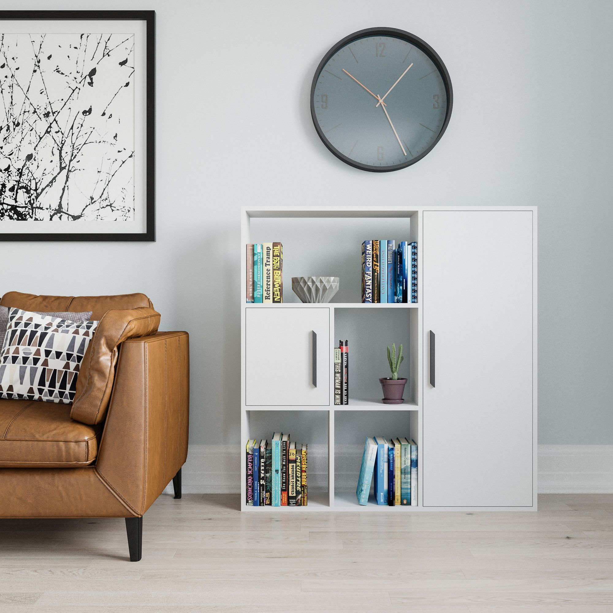 Bokhylla av melaminbelagd spånskiva.