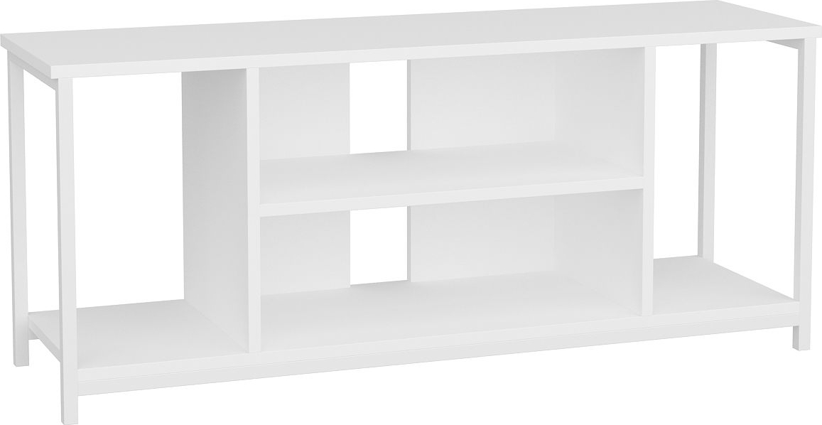 Mediabänk av metall med hyllplan av melaminbelagd spånskiva.