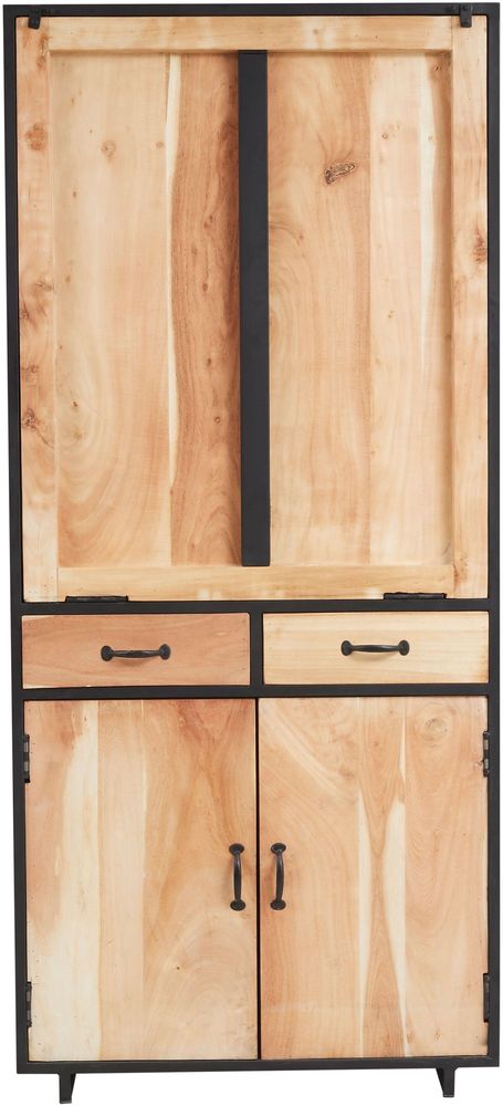 Skåp i gammaldags stil med dörrar av mangoträd, sidostycke- och bakstycke i svart. Det här är en kombinationsmöbel, överdelen av skåpet går att fälla ner till ett praktiskt bord, eller bänk. Stomme av metall.