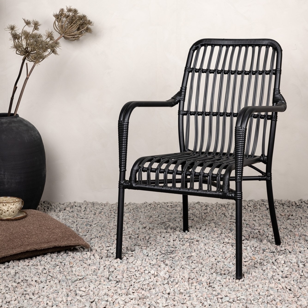 Loungestolen från serien Rizal kommer sätta en modern prägel på blickfånget i uterummet! Den här stolen har en avkopplande ramkonstruktion med integrerade armstöd i svart aluminium och detaljer i flätad rotting. Placera i loungehörnan eller solitär som stilikon - bara fantasin sätter gränser!