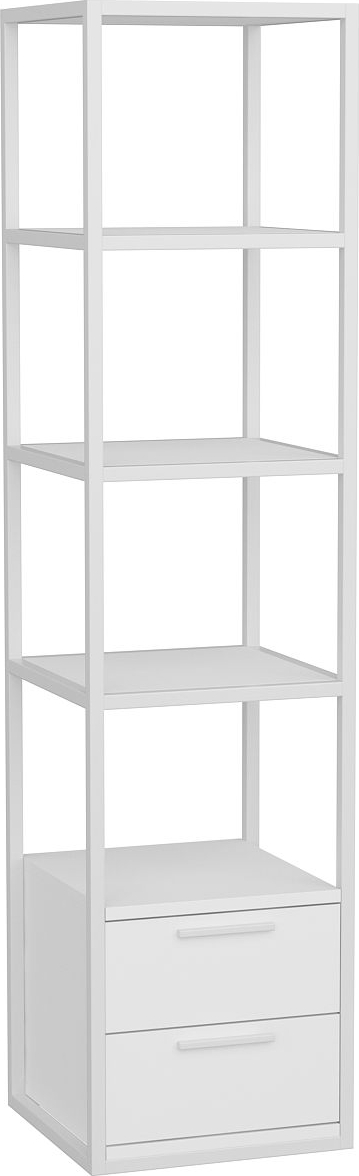 Bokhylla av metall med hyllplan av melaminbelagd spånskiva.