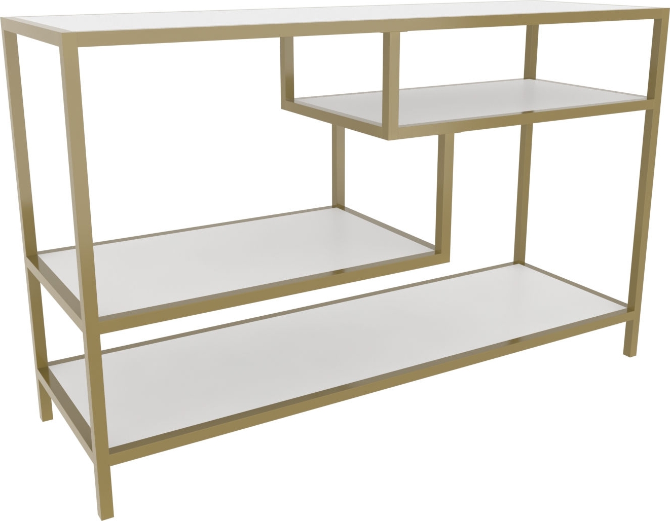 Mediabänk av metall med hyllplan av melaminbelagd spånskiva.