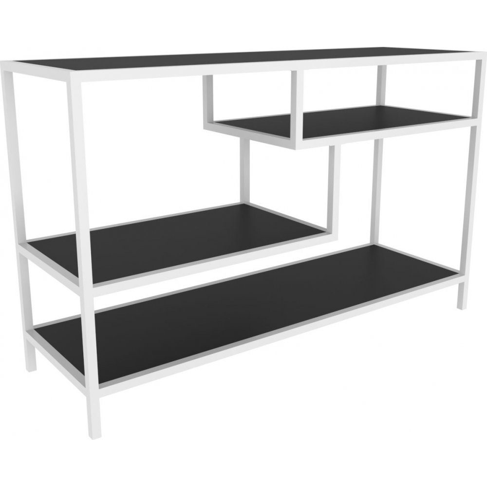 Mediabänk av metall med hyllplan av melaminbelagd spånskiva.