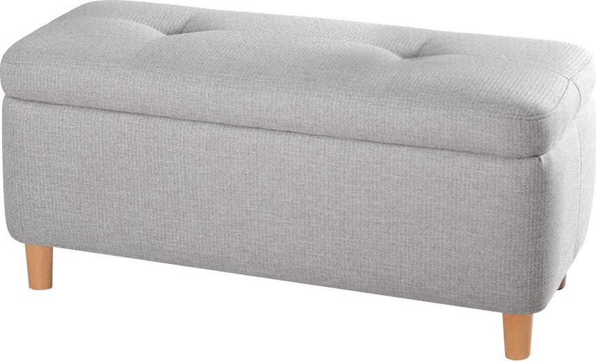 Sittpuff med förvaring. Klädsel av bomull och linne. Ben av bokträ.