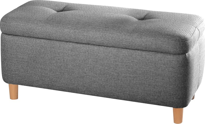 Sittpuff med förvaring. Klädsel av bomull och linne. Ben av bokträ.