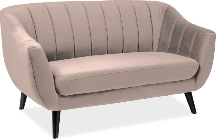 Soffa i bokträ och plywood. Klädd med polyestertyg i sammetsimitation.