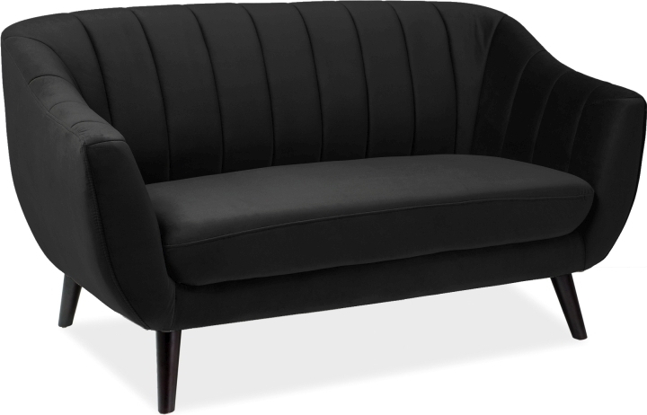 Soffa i bokträ och plywood. Klädd med polyestertyg i sammetsimitation.