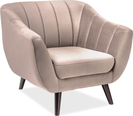 Fåtölj av bokträ och plywood. Klädd med polyestertyg i sammetsimitation.