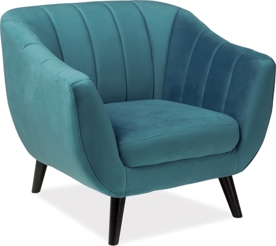 Fåtölj av bokträ och plywood. Klädd med polyestertyg i sammetsimitation.