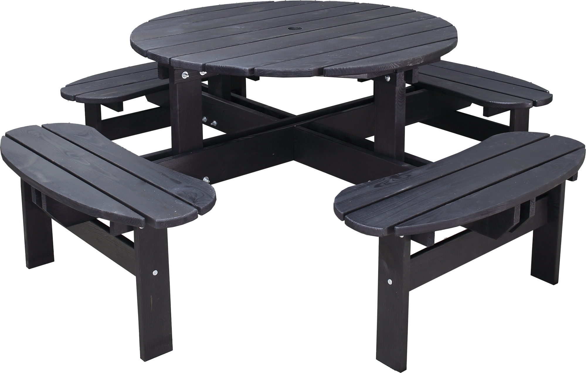 Ronda är en cirkelformad praktisk bänk med bord där man praktiskt kan sitta ner och äta eller annat. Robust i svartbrunt laserad furu, förberedd för parasoll.